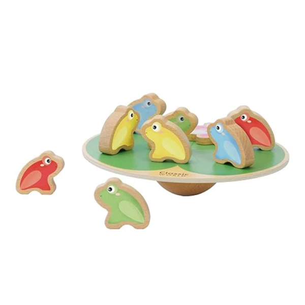 صفحهی تعادلی امکان تجربهی چالشی سرگرمکننده را فراهم میسازد. قورباغههای چوبی با رنگبندی شاد و اندازهی مناسب طراحی شدهاند تا کودک آنها را راحت جابهجا کند. ایجاد تعادل میان قطعات موجب تقویت تمرکز، هماهنگی چشم و دست و برنامهریزی حرکتی میشود.