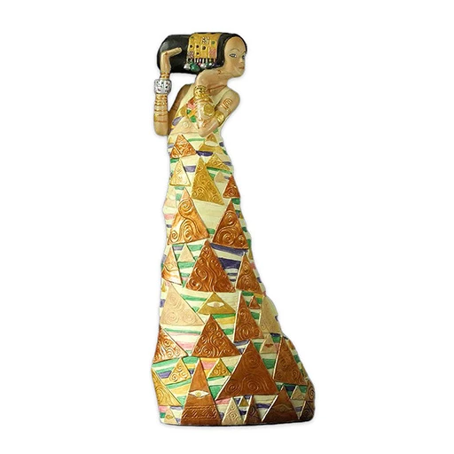 این مجسمه با الهام از نقاشی Expectation کلیمت طراحی شده و با رنگهای طلایی، سبز و کرم درخشان جلوهای مجلل دارد. بافت برجسته و طرح هندسی لباس، اصالت هنری را یادآور میشود و جنس رزین مقاوم آن کیفیت بالا و دوام طولانیمدت را تضمین میکند. مناسب برای دکور میز، ویترین یا فضای گالریهای خانگی است.