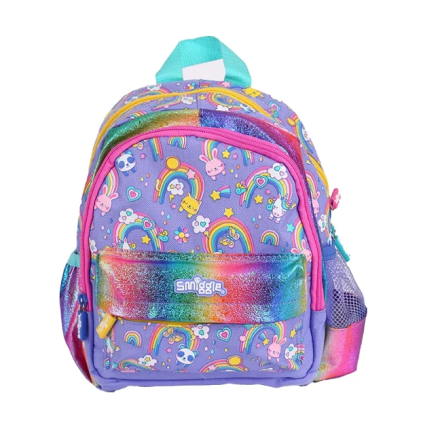کوله پشتی کوچک طرح رنگینکمان از برند معتبر اسمیگل، با طراحی شاد، رنگهای زنده و نقشهای فانتزی، انتخابی دلانگیز برای کودکان پرانرژی است. زمینهی بنفش کیف با چاپ زیبای رنگینکمان، ستارهها و کاراکترهای بامزه، نمایی چشمنواز دارد. ساختار سبک، مواد بادوام و ابعاد متناسب برای استفاده روزانه در مهدکودک یا گردش، کیفیت بالای محصولات اسمیگل را نمایان میسازد.
