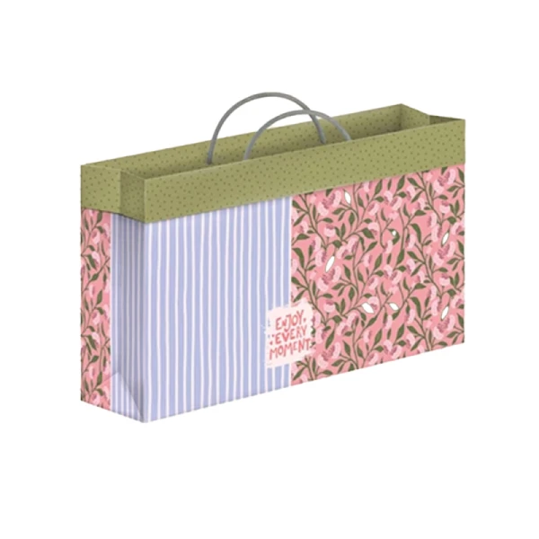 این بگ طراحی گلدار و لطیف با ترکیب رنگی هماهنگ دارد، چاپ آن با کیفیت و ماندگاری بالا انجام شده است و دستههای طنابی مقاوم دارد. ساختار مستطیلی آن برای بستهبندی اقلام بزرگ یا جعبهای بسیار کاربردی است و تنوع رنگ و بافت ظاهری، جلوهای خاص به هدیه میبخشد.