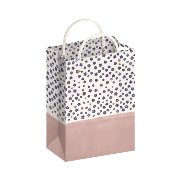 این بگ طراحی گلدار ریز و چاپ دقیق دارد، جنس مقوایی براق آن استقامت بالایی دارد و دستههای طنابی سفید رنگ ظاهری ظریف و مقاوم ایجاد کردهاند. رنگ صورتی ملایم در کنار سفید، حس آرامش و زیبایی بصری را افزایش داده است.