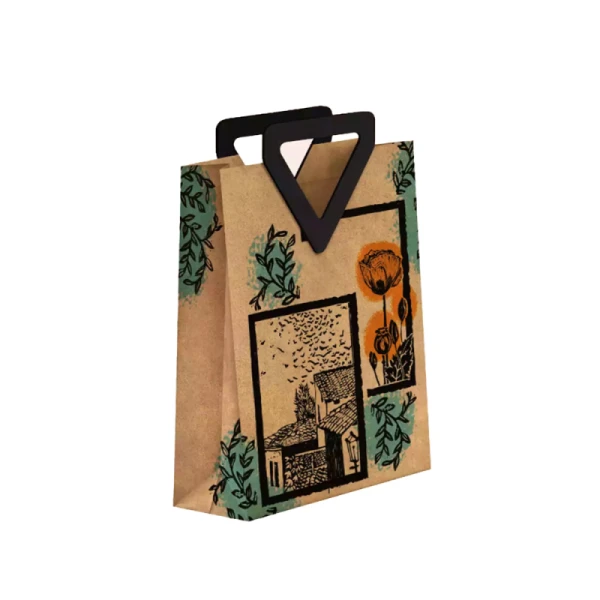 این بگ طراحی هنری با نقش طبیعت و خانه روستایی دارد، چاپ آن با رنگهای زنده و مقاوم انجام شده و دستهی مثلثی محکم دارد. جنس کرافت باکیفیت آن استحکام و دوام بالایی ایجاد کرده است. سبک طراحی، حس آرامش و سادگی را القا میکند.