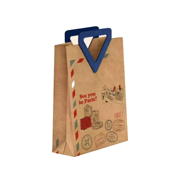 این بگ طراحی خاص الهامگرفته از سبک سفر دارد، چاپ چندرنگ دقیق و با دوام ارائه میدهد و با دستهی مثلثی آبی رنگ جلوهای مدرن و استوار دارد. ساختار کاغذ کرافت حس طبیعی و هنری به بستهبندی میبخشد.