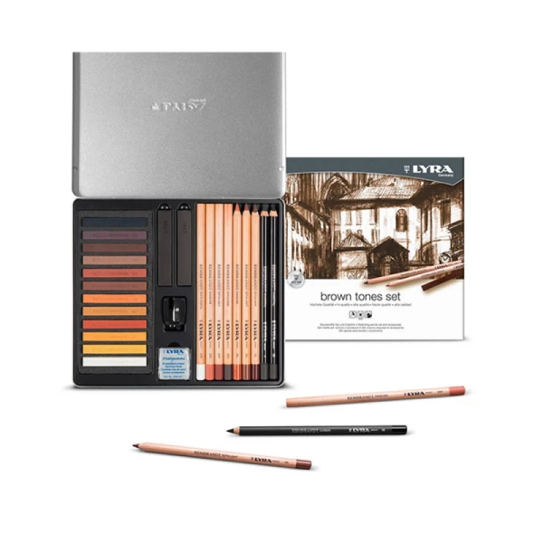 شامل قلمموها، پاستلهای نرم، مدادهای زغالی و رنگی در طیف قهوهای تا اخرایی است. تنوع ابزارها برای سایهزنی، حجمدهی و ترسیم دقیق خطوط کاربرد دارد. رنگهای طبیعی، بافت نرم و کیفیت بالای ساخت آلمانی، تجربهای روان و لذتبخش برای طراحی فراهم میکند و به خلق آثار هنری کمک میکند.