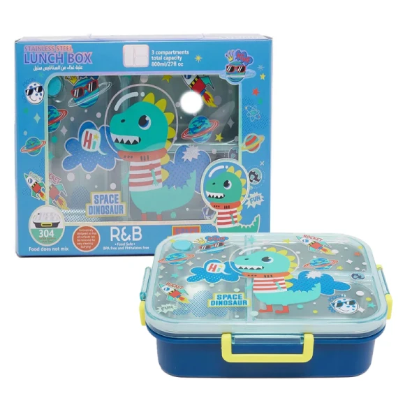 ظرف غذا مستطیل سه قسمتی استیل ۸۰۰ میل طرح دایناسور فضانورد (برند وست)