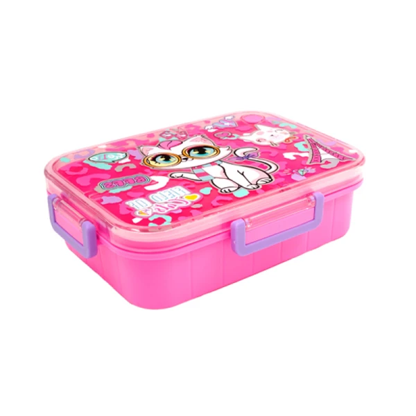 جنس این ظرف از پلاستیک فشردهی مرغوب ساخته شده تا سلامت غذا کاملاً حفظ شود و هیچ بوی اضافی در ظرف نماند. قفلهای یاسی در چهار طرف، درب را محکم نگه میدارند و مانع بیرون ریختن مواد غذایی هستند. رنگ صورتی بدنه در کنار درب شفاف و طرح گربهی عینکی، جلوهای شاد و دخترانه دارد که با هر نگاه لبخند روی لب کودک میآورد. طراحی سبک و مقاوم آن باعث میشود بهراحتی داخل کیف مدرسه جای گیرد و برای استفادهی روزانه کاملاً مناسب باشد.