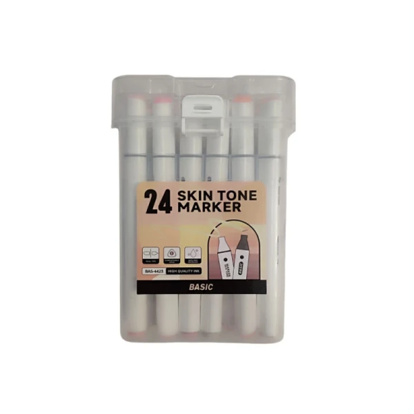 ماژیک راندو رنگ پوست ۲۴ رنگ برند بیسیک، مجموعهای کامل و حرفهای برای طراحان، هنرمندان و دانشجویان معماری و مد است. طیف متنوع از رنگهای کرمی، بژ، قهوهای روشن و تیره، به شما امکان میدهد با دقت بالا، سایهپردازی طبیعی و بافت پوست را در طراحیها خلق کنید. هر ماژیک دارای دو سر متفاوت است تا هم برای خطوط دقیق و هم برای سطوح گسترده کاربرد داشته باشد.